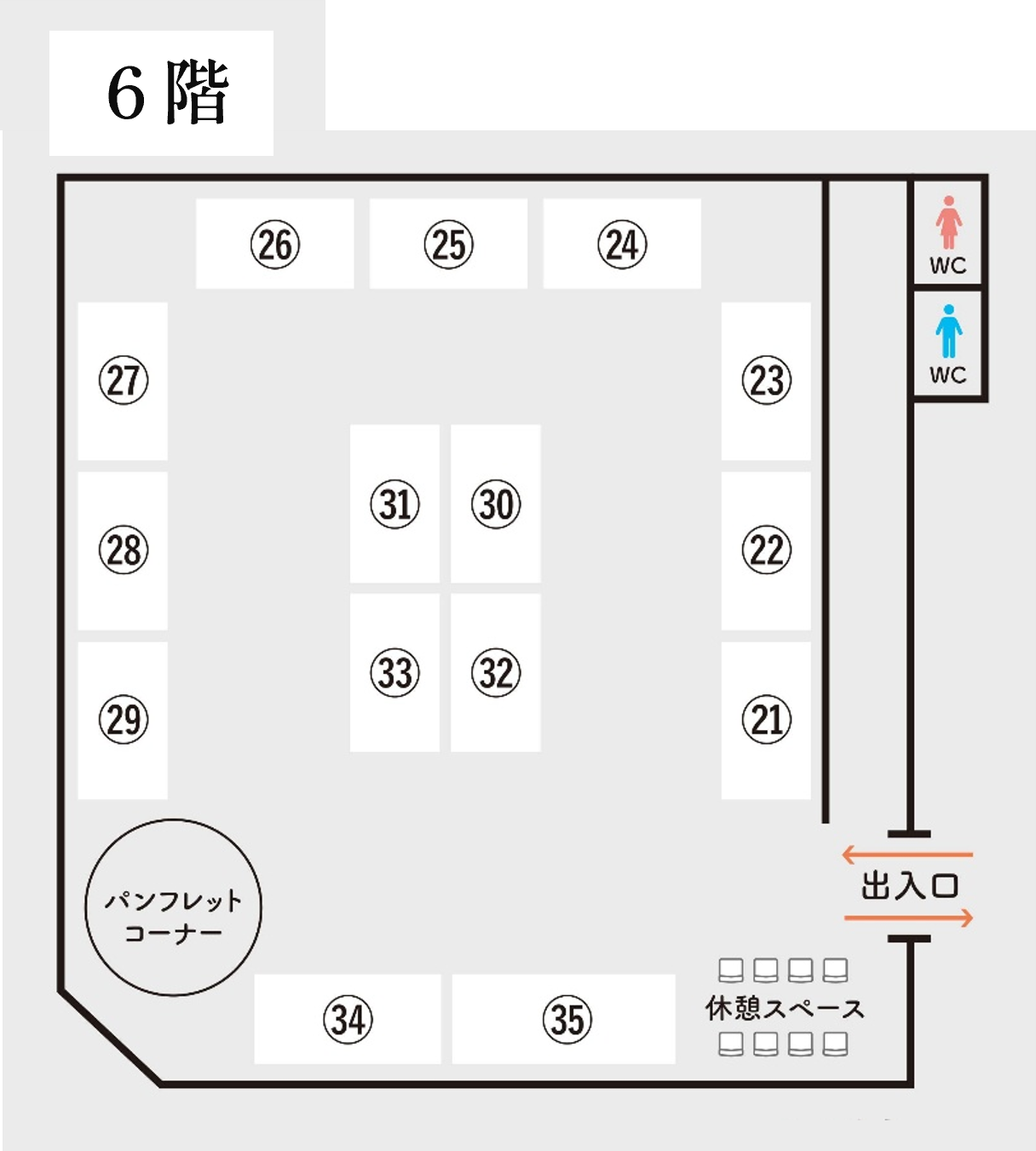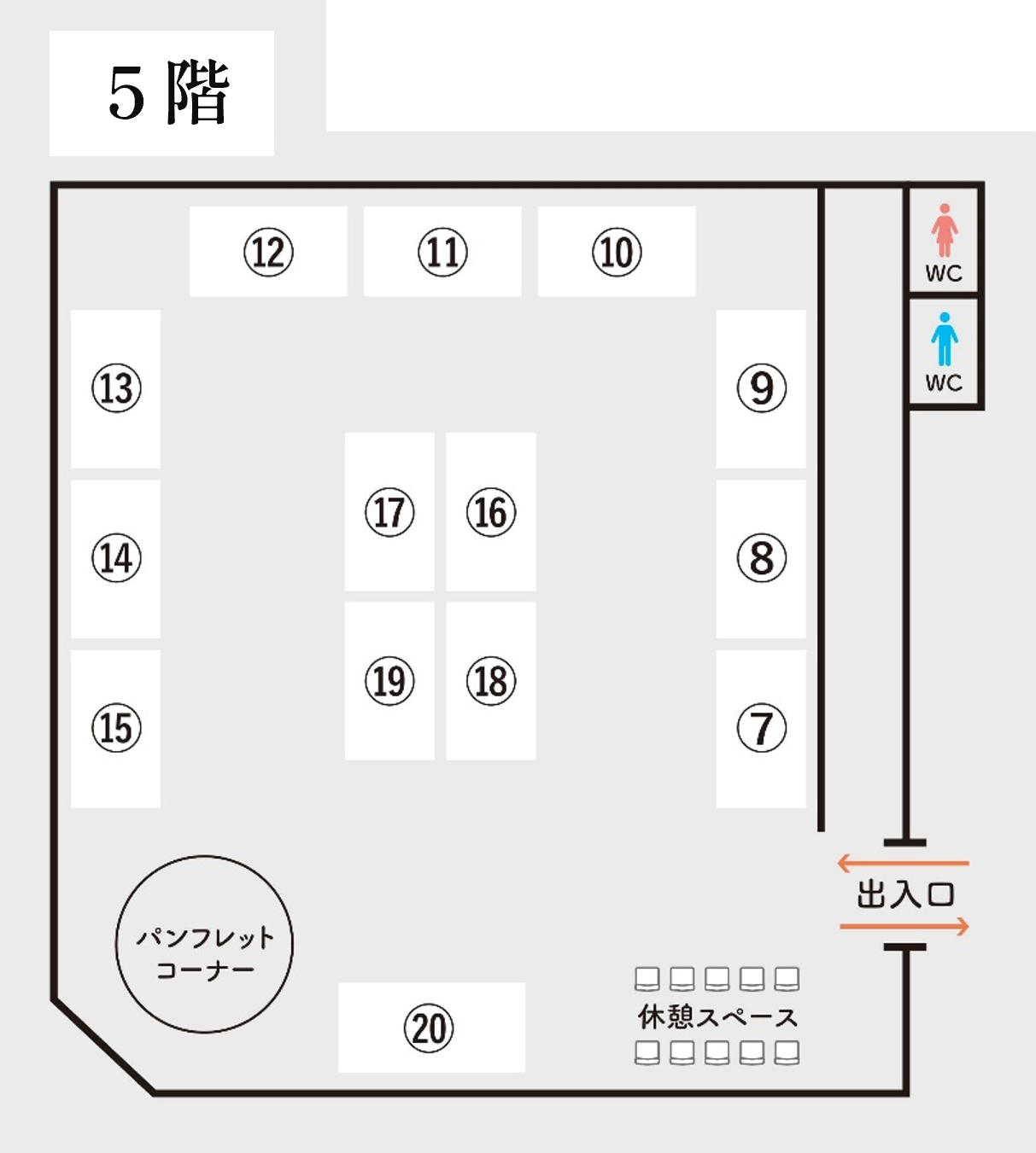 展示販売会に出展する企業等は次のとおりです。会場は1階・5階・6階に分かれ、1階が「家具」や「ペレットストーブ」などの大型のもの、5階と6階が「雑貨・食器・建材など」となっています。