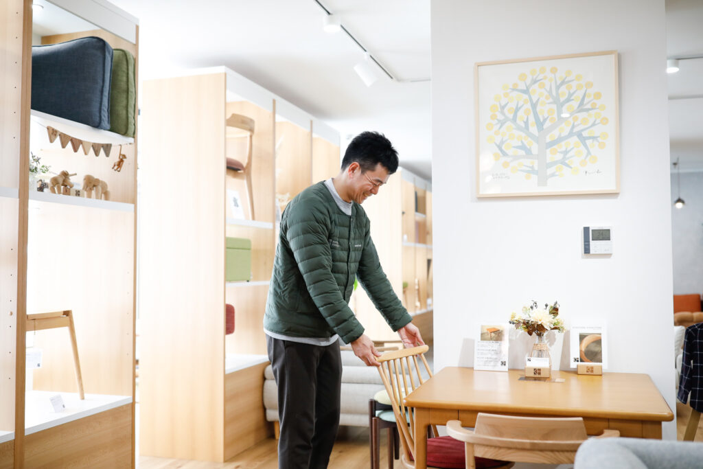 「KURIYAMA FURNITUREでは、ダイニングテーブル・チェア・テレビボード・ソファなど、主にリビングやダイニングで使用される家具をメインで取り扱っています。一部にナラ材の使用もありますが、主たる木材は北海道産のエルム材を使用。また家具は受注生産なので、既製品製造の他にも『テレビボードの幅がもう少しほしい』や『円形のダイニングテーブルを探している』と言ったご要望にもお答えすることができます。これは、技術がある家具職人がいるからこそ成せることだと思っています」
