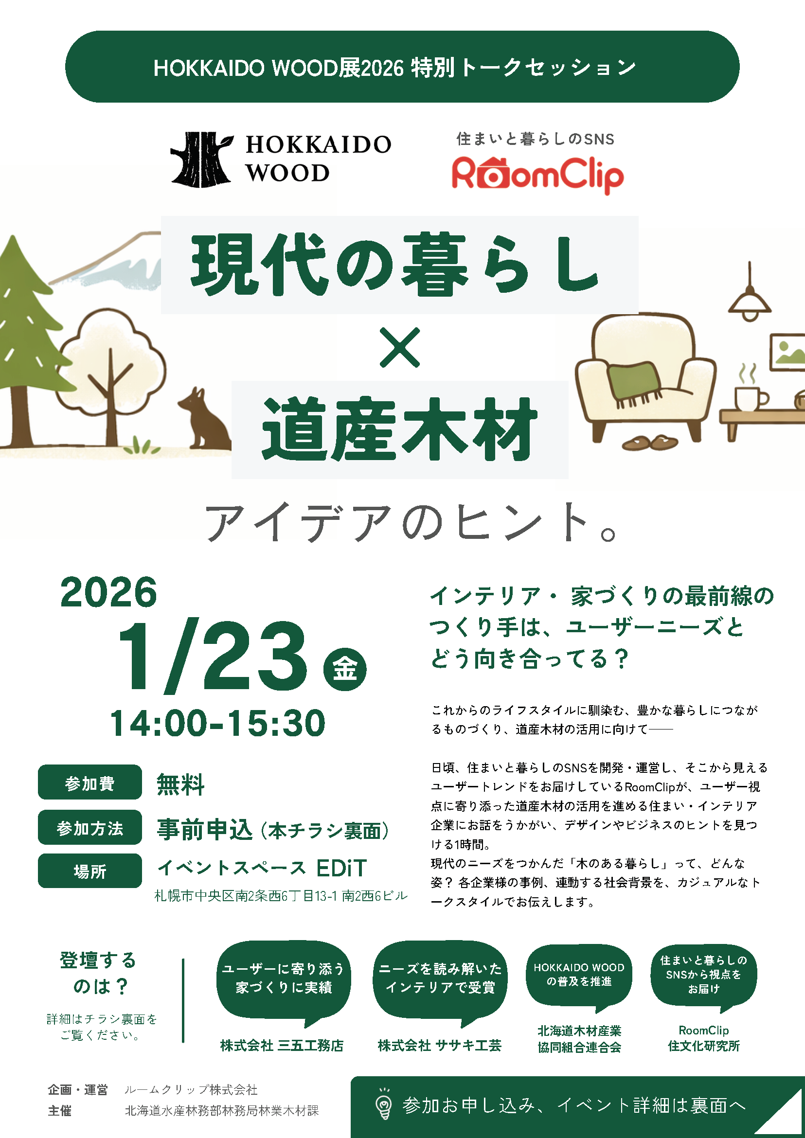 今年で3回目を迎える「HOKKAIDO WOOD展2026」の開催にあわせて、住まいづくりに携わる皆さまに向けた特別トークセッションが開催されます。住まいと暮らしに特化したSNS「RoomClip」を運営するルームクリップ株式会社がモデレーターとなり、最新のユーザートレンドから読み取れる「これからの住まいと暮らし」に関する「新定番キーワード」をもとに、北海道で実際に家づくり・モノづくりに携わる企業と、これからのライフスタイルに馴染みながらも豊かな暮らしにつながる道産木材の活用に向けてトークセッションを行います。